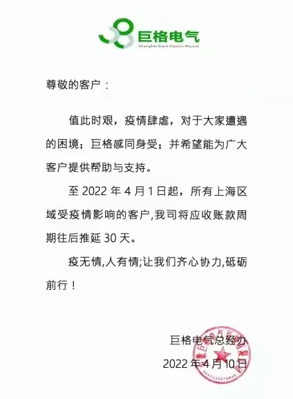 此外,对于上海区域受疫情影响的客户,我司将应收账款周期往后推延30天。疫情无情,人有情,同心聚力,守望相助才能攻克时艰!