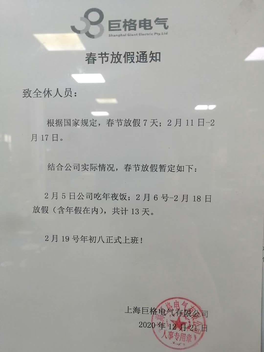 2021年春节放假通知