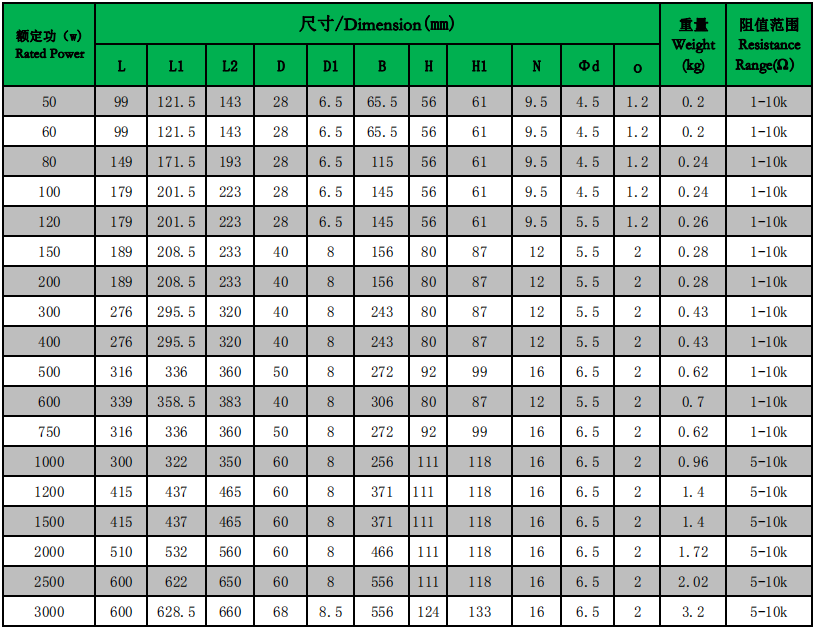 3、额定阻值范围:1Ω-10KΩ 3、Resistance Range:1Ω-10KΩ